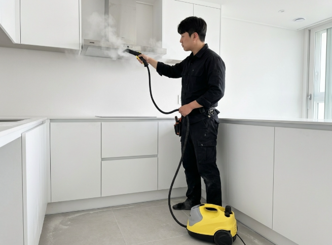 여기서 카처 스팀기가 등장합니다. 100도 고온 스팀으로 오염을 녹여내는 방식입니다. 약품으로 닦는 것보다 훨씬 효과적이고, 잔향도 남지 않습니다.