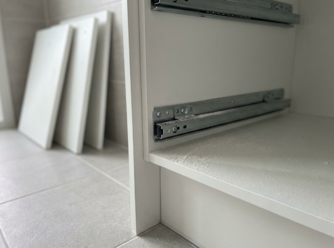 서랍 빼고 레일 안쪽 들여다보면 하얀 분진이 켜켜이 쌓여있습니다. 신축 아파트라 공사 먼지가 그대로 들어간 겁니다. 이걸 그대로 두고 입주하시면, 서랍 열 때마다 먼지가 날립니다.