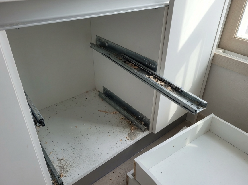 탈거된 서랍과 레일 안쪽에 보이는 먼지