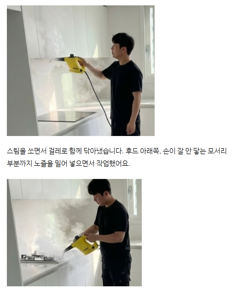4. 잔향 없음 스팀은 물이 증발하면서 사라집니다. 청소 후 화학약품 냄새가 남지 않아요. 입주 당일 바로 생활 가능합니다.