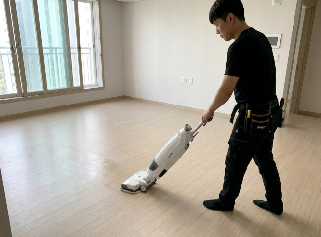 ▲ 거실 바닥 청소 - 아이맙 청소기로 시멘트 분진 완벽 제거